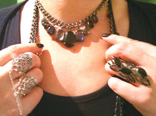Chains are from Sussan. the choker chain is from Diva. The black stone ring is a christmas gift from my sister and the chain rings are from Sportsgirl. I'll spend up on quality items, but only buy cheap costume jewellery.